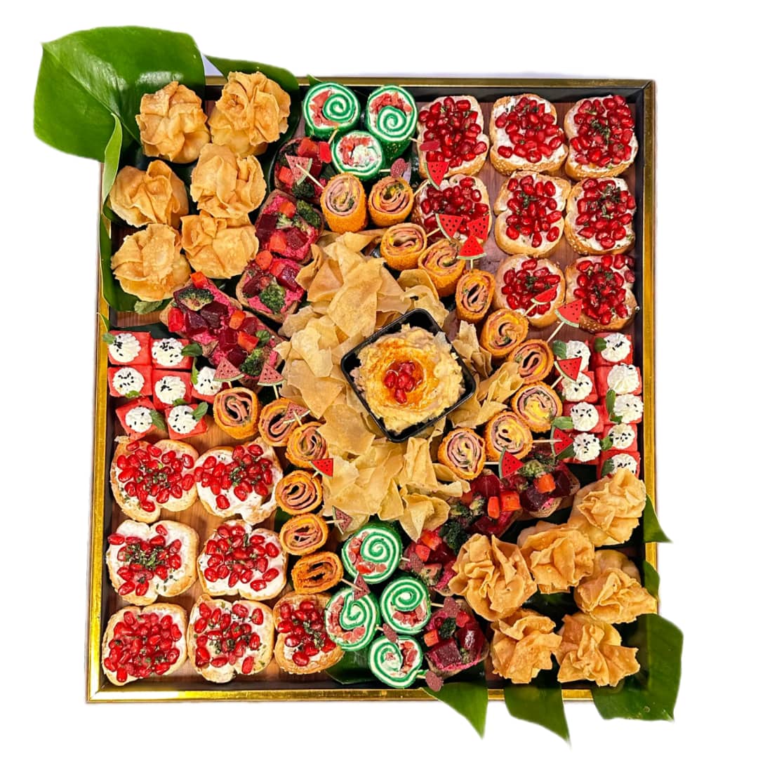 12 عدد وانتان مرغ و پنیر/15 عدد کاناپه انار و پنیر/15 عدد هندوانه و پنیر/10 عدد کاناپه لبو و سبزیجات/16 عدد رول ژامبون و پنیر/7 عدد رول اسفناج و پنیر/1 عدد دیپ حمص/چیپس پیتا |